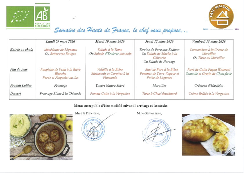 PLACE DANIEL BRETON Téléphone : +33 3 21 29 18 71 Fax : +33 3 21 29 77 75 A V E N I R Le 10 mars 2026 : Certification allemand (3e bilangue). Le 10 mars 2026 de 13h30 à 16h30 : Théâtre en anglais (élèves de 5e). Le 10 mars 2026 de 17h45 à 18h45 : Conseil d'administration. Le 11 mars 2026 : Oral de stage (élèves de 3e). Le 13 mars 2026 de 8h00 à 10h30 : Visite du lycée Hennebique (élèves de 3e2, 3e3, 3e5). Le 13 mars 2026 de 9h00 à 12h00 : Projet Egalité, visite de l’école Morieux. |