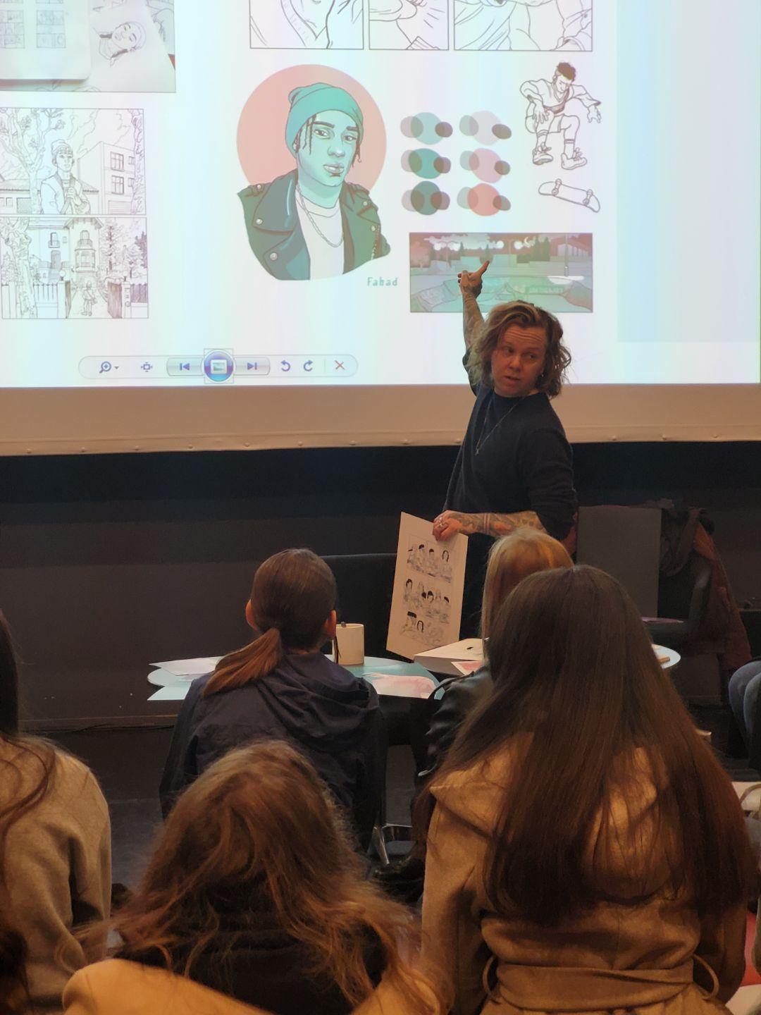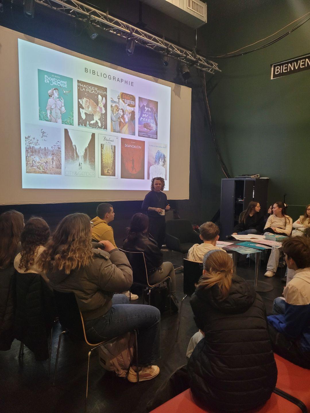 Ce jeudi 27 novembre, les élèves de 3e2, 3e5, 3e6 et les élèves de 4e, 3e du club égalité se sont rendus à la médiathèque Estaminet afin de rencontrer Jul Maroh et ont pu échanger autour de son métier.